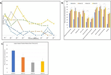 (B) 狼瘡影響追蹤器 (LIT) 是指研究期間的影響。從第12周開始,LIT顯著下降,并持續(xù)到第52周 (p=0.007)。誤差線表示SD。代表完成試驗(yàn)至52周的5名患者的分?jǐn)?shù)。