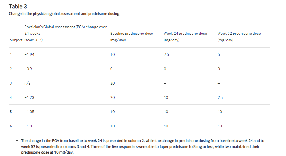 表3:醫(yī)生總體評(píng)估和潑尼松劑量的變化