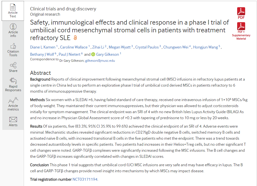 結(jié)論:這項(xiàng)1期試驗(yàn)表明,臍帶 (UC) MSC輸注非常安全,并且可能對(duì)狼瘡有效。β細(xì)胞和GARP-TGFβ的變化為MSC影響疾病的機(jī)制提供了新的見解。