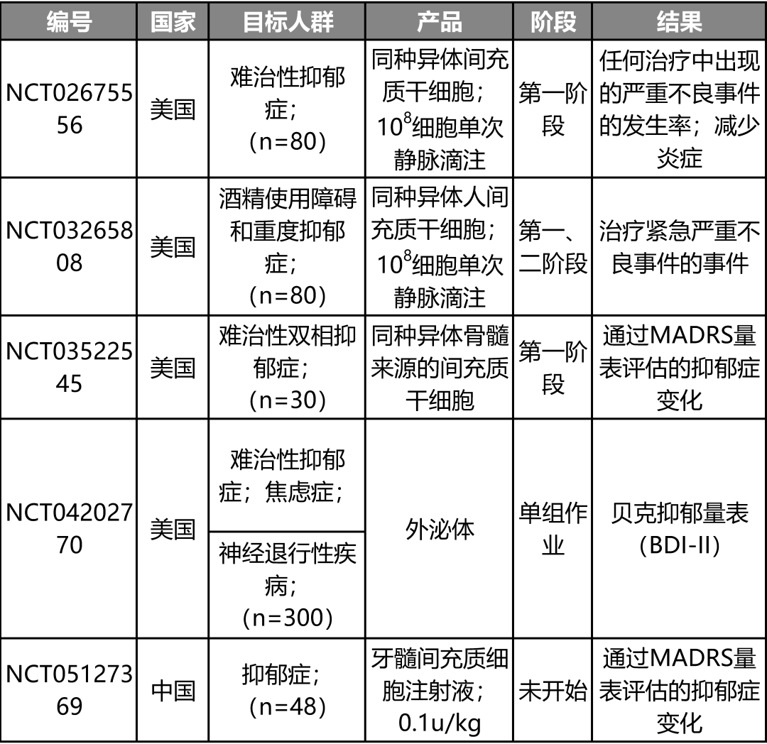 關于干細胞在臨床中的應用,我們在https://clinicaltrials.gov/找到了五項涉及使用間充質干細胞及其外泌體治療抑郁癥患者的注冊臨床研究。目前,其中四項臨床研究(1期和2期)正在評估MSCs和外泌體給藥的安全性、有效性和耐受性。