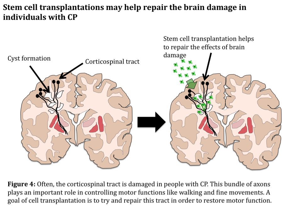 迄今為止,僅發表了一項研究的結果。這項研究有三組兒童參與者:僅接受傳統康復治療的兒童,接受促紅細胞生成素藥物(顯示有希望治療腦癱)和傳統康復治療的兒童,或接受臍帶血(含有干細胞)+促紅細胞生成素的兒童+常規康復治療。研究發現,與其他治療組相比,接受干細胞治療的組在認知和運動評估方面表現出更大的改善。