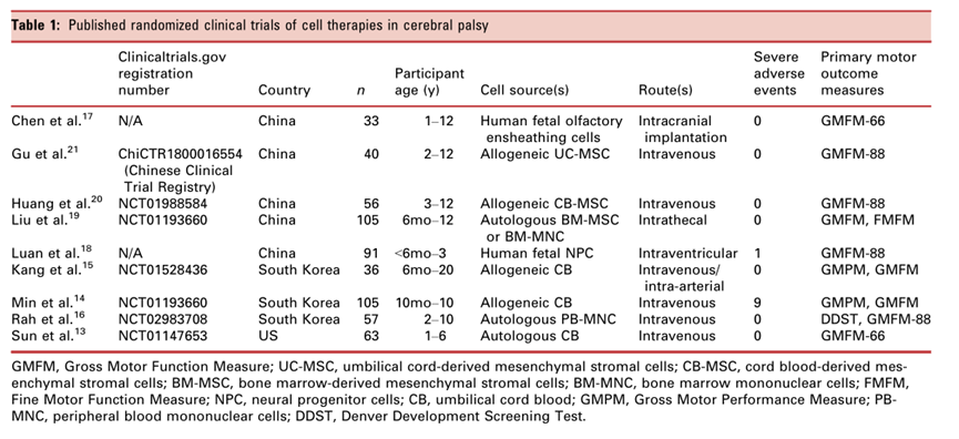 數(shù)據(jù)統(tǒng)計顯示,多個國家已經(jīng)報道了至少20項針對有發(fā)生腦癱風(fēng)險患兒或腦損傷患兒的細胞治療的臨床試驗,還統(tǒng)計到9項隨機研究正在進行中,一項在美國進行,三項在韓國進行,五項在中國進行。
