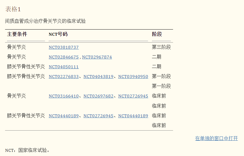 使用關鍵詞“基質血管部分”和“骨關節炎”搜索臨床研究數據庫(https://www.clinicaltrials.gov/)。剔除撤回研究后,得到目前SVF治療骨關節炎的臨床試驗研究,見表格1。