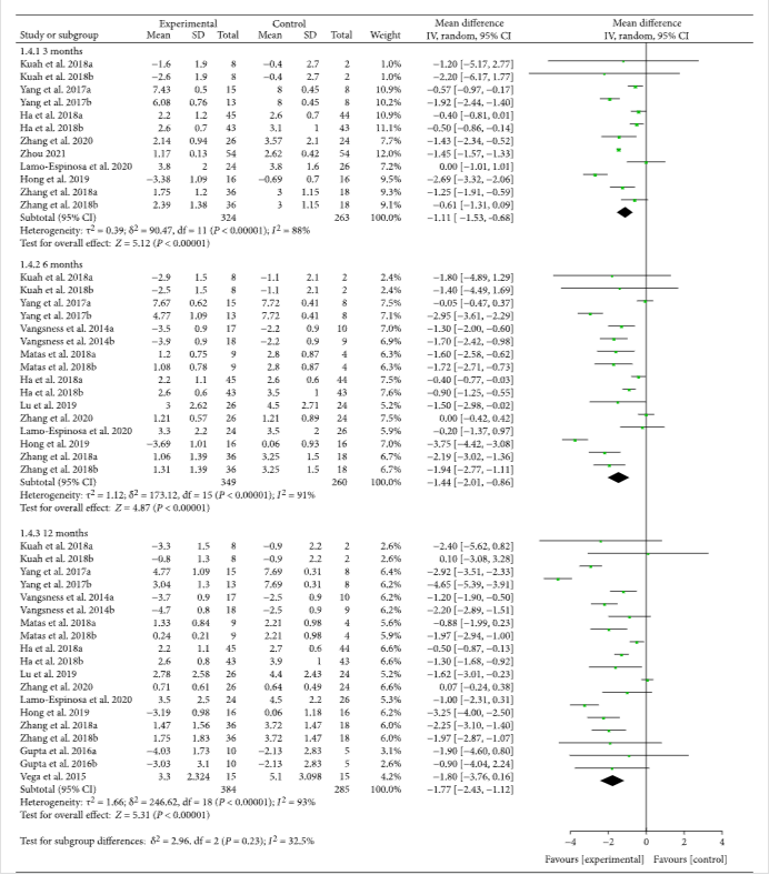 十三項(xiàng)臨床試驗(yàn)報(bào)告了具有精確值的VAS。結(jié)果還顯示,MSC注射后第3個(gè)月隨訪VAS較對(duì)照組有所降低[-1.11(-1.53??,-0.68),],且效果至少持續(xù)12個(gè)月[-1.77(-2.43,-1.12),](圖2)。VAS的改善可能具有臨床意義。