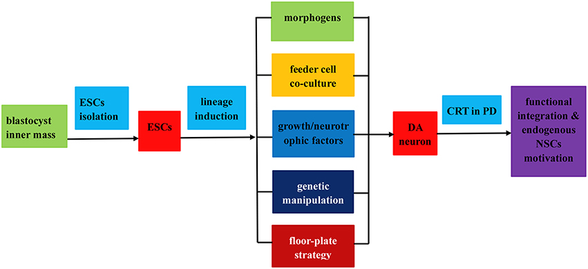 整個(gè)過程分為以下三個(gè)步驟: (1) 從胚泡內(nèi)塊分離胚胎干細(xì)胞;(2) 通過 (i) 應(yīng)用形態(tài)發(fā)生素或可溶性生長因子誘導(dǎo)ESC分化為DA神經(jīng)元;(ii) 飼養(yǎng)細(xì)胞共培養(yǎng);(iii) 遺傳操作;(iv) 底板譜系誘導(dǎo)策略;(3) 通過功能整合和內(nèi)源性NPCs動(dòng)機(jī)在PD治療中移植誘導(dǎo)的DA神經(jīng)元。