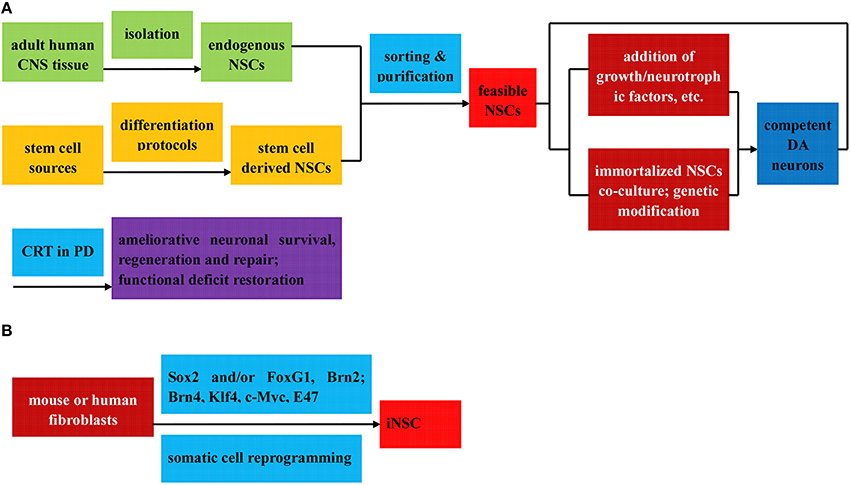 (3) iNSC,由Sox2從小鼠或人成纖維細(xì)胞重新編程,有或沒有其他轉(zhuǎn)錄因子(B); 所有這些都可以進(jìn)一步分選和純化以獲得可行的NSCs。