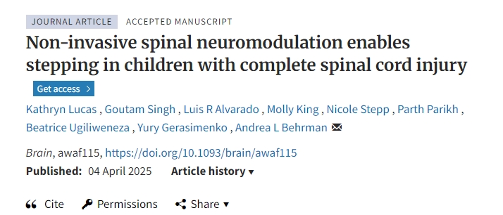 [1]Kathryn Lucas, Goutam Singh, Luis R Alvarado, Molly King, Nicole Stepp, Parth Parikh, Beatrice Ugiliweneza, Yury Gerasimenko, Andrea L Behrman, Non-invasive spinal neuromodulation enables stepping in children with complete spinal cord injury, Brain, 2025;, awaf115, https://doi.org/10.1093/brain/awaf115