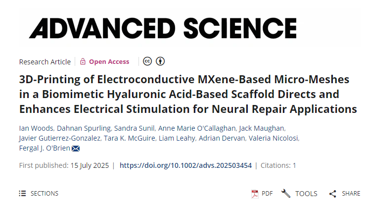 Journal of Orthopaedic Science,2025,,ISSN 0949-2658,https://doi.org/10.1016/j.jos.2025.06.013.[14]I. Woods, D. Spurling, S. Sunil, A. Marie O’Callaghan, J. Maughan, J. Gutierrez-Gonzalez, T. K. McGuire, L. Leahy, A. Dervan, V. Nicolosi, F. J. O’Brien, 3D-Printing of Electroconductive MXene-Based Micro-Meshes in a Biomimetic Hyaluronic Acid-Based Scaffold Directs and Enhances Electrical Stimulation for Neural Repair Applications. Adv. Sci. 2025, e03454. https://doi.org/10.1002/advs.202503454