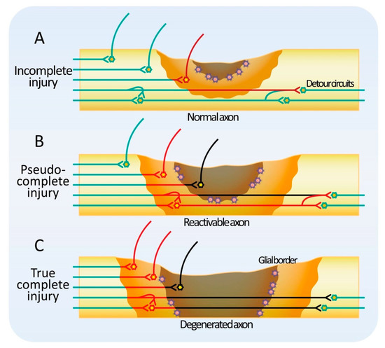 ( C ) 真正的完全傷害。無神經組織(灰色)橫跨整個脊髓,在頭端或尾端對周圍可再激活組織的治療無法提供功能性顱骨連接。