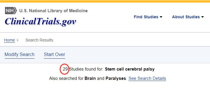 截止2022年12月,在美國國立衛生研究院的最大臨床試驗注冊庫clinicaltrials.gov網站上注冊的有關干細胞治療小兒腦癱的臨床研究項目有29項,其中中國有三項。所涉及干細胞類型有神經干細胞、骨髓干細胞、臍帶間充質干細胞等,其中有些項目已經完成,有些正在招募。