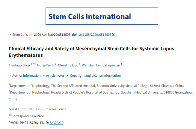 2020年4月3日,汕頭大學醫學院在國際期刊《Stem Cell International》上發布了一篇《間充質干細胞治療系統性紅斑狼瘡的臨床療效及安全性》的研究結果。