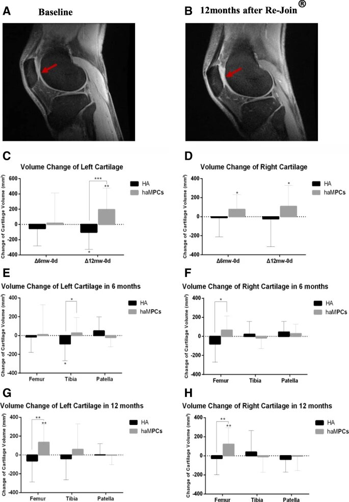 同時,12個月后,通過MRI測量,Re-Join?組雙膝關節軟骨體積的增加明顯多于HA組。兩組之間的AE具有可比性。大多數AE是輕度和中度的,除了HA組中右膝關節感染的一個SAE。