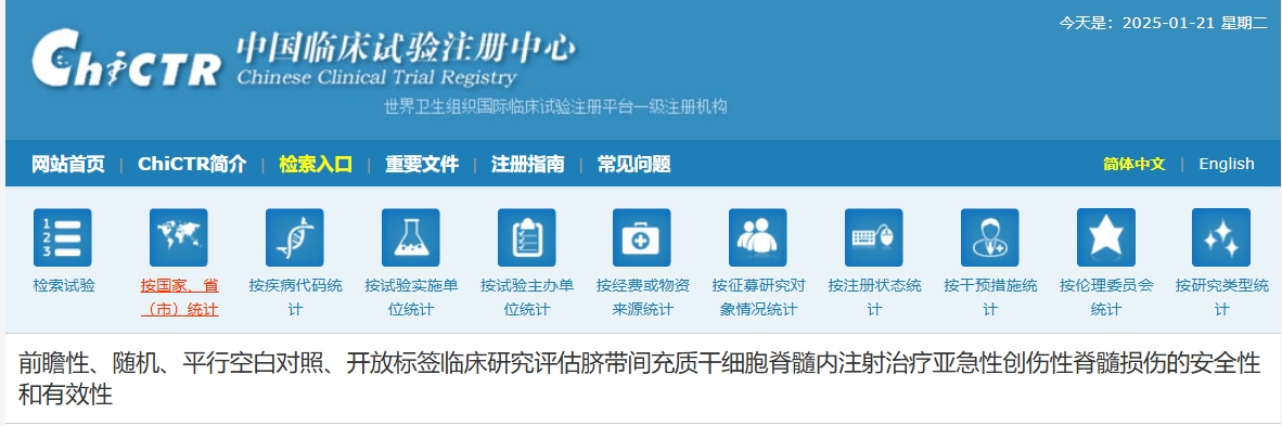 2025年1月20日,西安高新醫院在《中國臨床試驗中心》上注冊了一項關于“前瞻性、隨機、平行空白對照、開放標簽臨床研究評估臍帶間充質干細胞脊髓內注射治療亞急性創傷性脊髓損傷的安全性和有效性”的臨床試驗正在招募患者,這一消息無疑為廣大脊髓損傷患者帶來了新的希望!
