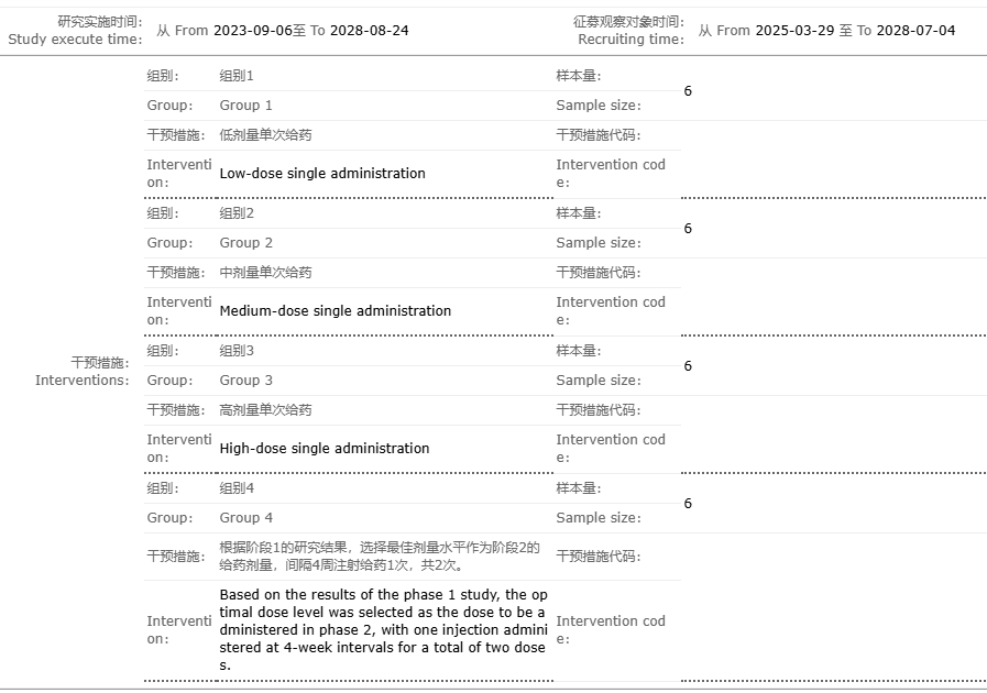 本研究分為兩個階段,第一階段將設置低、中、高三種劑量單次給藥組,每組各6名受試者;第二階段則將在第一階段基礎上,選取最佳劑量方案,采用間隔4周注射一次,共兩次的給藥方式。