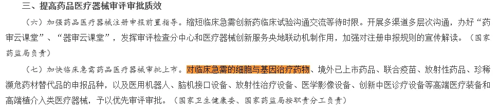 1. 審評審批提速:創新成果更快惠及患者《意見》明確指出,對臨床急需的基因與細胞治療藥物實行優先審評審批,并大幅縮短審批時間。例如,臨床試驗審批時間從60個工作日縮短至30個工作日。這一舉措打通了從實驗室到市場的“最后一公里”,讓科研成果得以及時轉化,更快服務于患者。