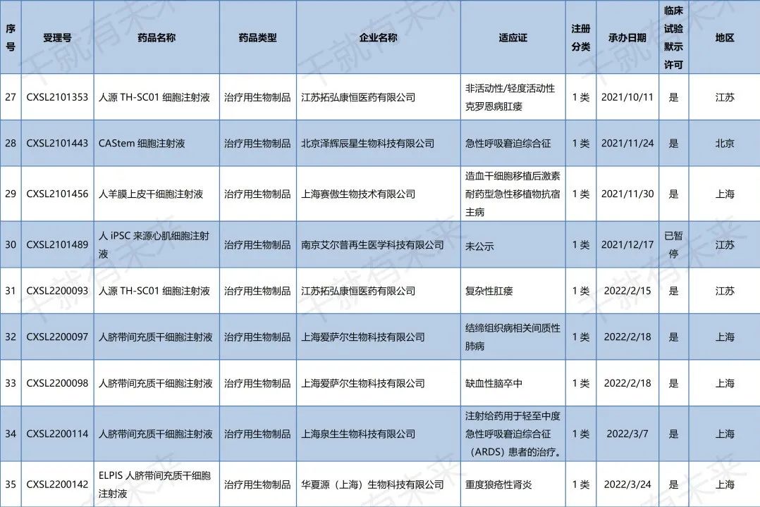 上海泉生生物科技有限公司的“人臍帶間充質干細胞注射液”的藥物臨床試驗申請獲得默示許可(受理號:CXSL2200299與CXSL2200301),適應證為:強直性脊柱炎和Ⅱ度燒傷。