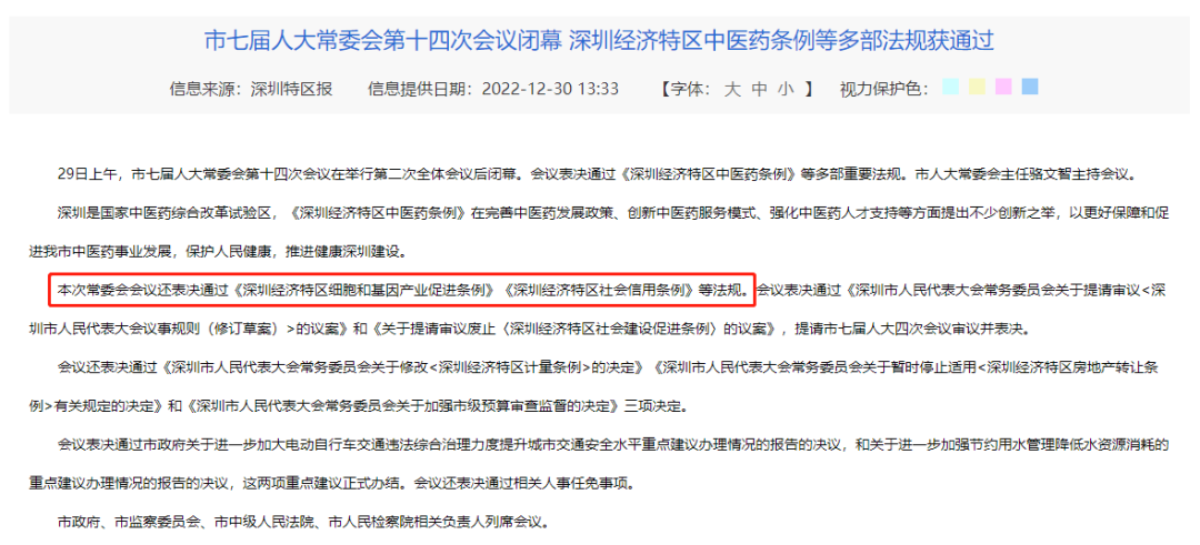 深圳市第七屆人大常委會(huì)第十四次會(huì)議正式表決通過《深圳經(jīng)濟(jì)特區(qū)細(xì)胞和基因產(chǎn)業(yè)促進(jìn)條例》